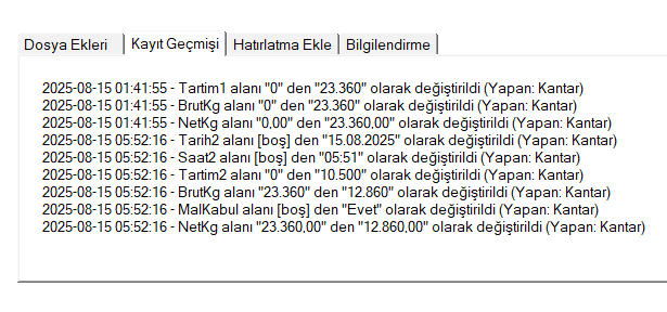 - Tüm formlarda hangi alanın değiştirildiğini, önceki değerinin ne olduğunu ve ne olarak değiştirildiğini kayıt eder.